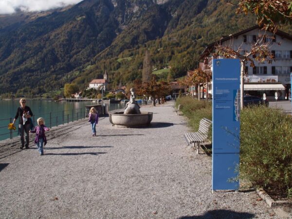 Die Möblierung der Brienzer Visitenstube, des Quais, mit der schönen Aussicht auf See und Berge wird aus drei Elementen bestehen: Wasser, Pflanzen und Infrastruktur. Zur Infrastruktur zählt ein Holzsteg in Wassernähe, zählen Sitzmöbel, Beleuchtung, Toilettenpavillons, eine Pergola in Lindellen, Tafeln für die Besucherinformation, themenbezogene Spielgeräte für Kinder und Erwachsene. Das Element, das die Gestaltung auf der ganzen Länge prägen soll, ist das Wasser. Es wird gewissermassen auf den Quai geholt. Die Inszenierung des Wassers könnte mit einem Springbrunnen im See in Lindellen beginnen und mit einem Wasservorhang bei der Schifflände enden.