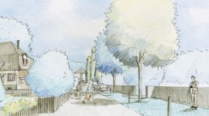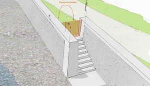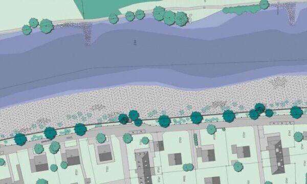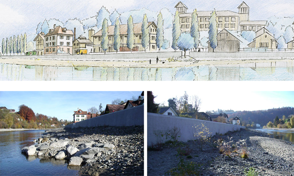 Zugänge zur Aare durchbrechen die Mauer und dienen sowohl der Freizeitnutzung wie auch der ökologischen Vernetzung. Im Hochwasserfall können diese mobil verschlossen werden. Eine Baumreihe begrenzt das Wohnquartier, Säulenpappeln markieren Übergänge und standortgerechte Gehölzgruppen begleiten die Aare.Die Mauer selbst wird mit Aarekies, gestrahlter Oberfläche und leichten Anzug ausgeführt, so dass sie nicht im Kontrast zu den Kiesbänken steht, sondern aus ihnen ‚herauswächst‘.